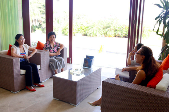 到达鲁能•三亚湾高尔夫俱乐部后,9159金沙游戏场高尔夫专业老师们向鲁能俱乐部经理了解13级高尔夫实习生们在实习期间遇到的困难与经历。