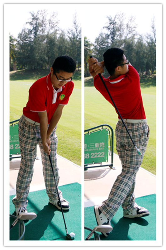 13级高尔夫实习生佟皓,在为老师们做打高尔夫球的动作指导。