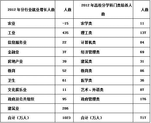表一的第一列的计算方式是2012年分行业就业人数减去2011年分行业就业人数,第三列是2012年中国高校人才分学科培养人数。表一反映了目前中国每年以7%左右的经济增长速度可多容纳1000万人就业。本表中选取的行业均是可吸纳大学生就业的行业,餐饮、批发、运输等行业由于其特殊性则没有选取。
