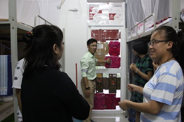 石玲和夏琦山二位导师带领着各班的班干部到学生所在的部分宿舍走访、视察。对在台风来临时宿舍的应对措施进行安排。导师们重点查看了学生们的屯水以及储存食物的情况,并且关心同学们寝室安全问题,告诉同学们要把门、阳台的玻璃镜子等物品用胶带加固以防风力大时破损,同时要求同学们一旦出现门、玻璃等物品损坏的情况要及时进行报修,强调台风期间安全第一,做好充分准备,应对台风可能会带来的种种问题。