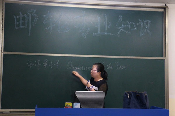 紧接着张颖超老师从三个方面论述了有关邮轮方面的知识,一、邮轮的初认识,先是以图片的形式给同学们展示了世界上现有的邮轮,例如:处女号邮轮、星梦邮轮、量子号邮轮等邮轮外形图;再具体地展现了邮轮内部的设施,如:自助餐厅、康乐部、健身房、客房等一系列的邮轮内部图景。让同学们通过看图的形式更加直观地去了解到整搜邮轮的内外部的组织构架,感受邮轮上究竟可以带给顾客什么样神奇旅程的体验;二、邮轮的再认识,以邮轮与游船二者之间的区别通过对比的形式生动地对邮轮进行剖析,让同学们能更好地去理解邮轮与游船的区别,最后再通过嘉年华丘纳德航运公司正在建造的“自由之船”作为一个具体的实例跟同学们解读了一下在未来邮轮上我们即将可以享受到的一种不一样的服务,比如在“自由之船”上会建造有学校、机场、医院等在陆地上可以享受到的设施与服务,让邮轮变成一个行走在海洋中的陆地;三、为什么要上邮轮,通过文字的形式,跟同学们系统性地说明了在邮轮上工作的每个船期以及工作的时数以及在邮轮上工作时可以享受到的福利以及优渥的待遇。通过这几个方面的介绍让台下听讲的同学都产生了对于在邮轮上工作的向往以及那种跃跃欲试加入邮轮行业的冲动。