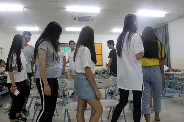 班里气氛越来越嗨,游戏也会接着不断,所以第三个游戏“击鼓浪花”也要开始了,由班长背对大家在黑板上一直敲着直到响声停止柚子皮落在谁手上谁就要上台一起玩“纸张站立”,男同学和女同学一起踩一张纸,轮到下一组都会把纸张折小,那么问题来了,纸张越来越小,两个人怎么能一起踩到上面呢?慢慢发挥你们的想象力吧!