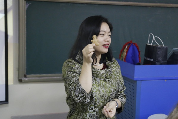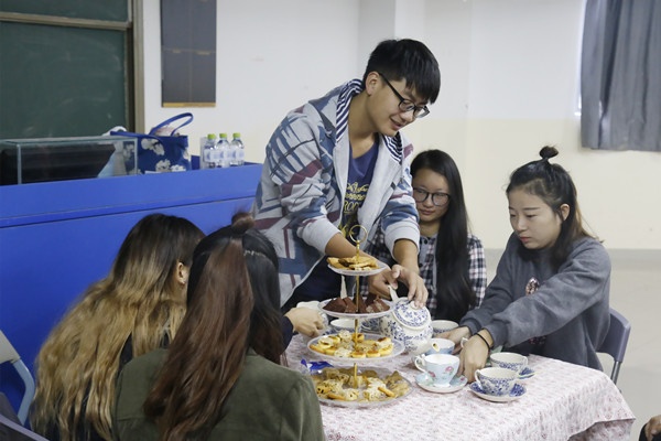 2016年12月29号早上8:30南区书知楼1208教室里迎来了余燕伶老师本学期系列讲座的最后一讲,先到的同学们获得了入座嘉宾席,享受英式下午茶的特殊待遇。在教室中心,余老师精心布置了一桌点心,并带来了精致的英式下午茶茶具,配上用80度的水泡开的英国红茶,带给同学们优雅的下午茶体验。