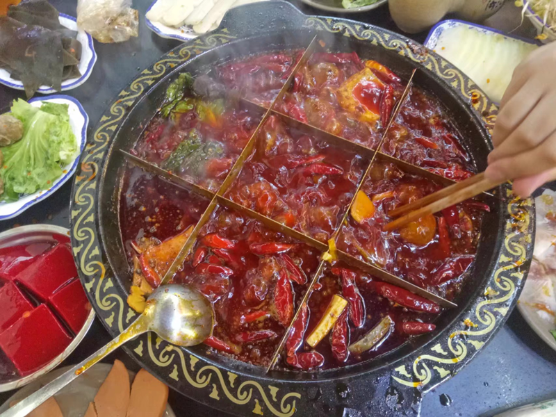 怀抱着这样的心情我和朋友去吃了好几顿难忘的火锅。重庆火锅以麻辣著称,素以大盆代锅,盆里是翻滚的红汤,汤面上漂浮着麻椒、花椒,以及一些让人叫不出名来的作料。这样红红的锅底看上去就给人又麻又辣的感觉,暗搓搓的等锅开涮肉。感受过几回重庆火锅之后,我更加的深爱上了它。