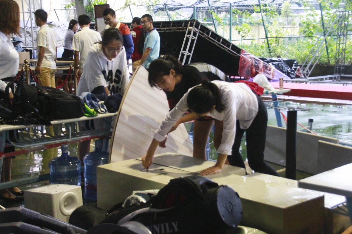 早上6点,所有人员已经全部到位,准备迎接17级新生的到来。由于事先的详细布置及周密的人员安排,准备工作进行的有条不紊,清洗地面,搬运桌子、悬挂横幅、张贴海报、布置展板,繁琐的工作并没有减弱工作人员的热心,事事都要求做到精准高效,内心充满对学弟学妹的期待,学生干部忙碌的身影相得益彰,相关负责老师尽职尽责地指导俨然成为了迎新准备工作中一道道靓丽的风景线,即使台风天气,也依然不能阻挡我们迎新的热情。