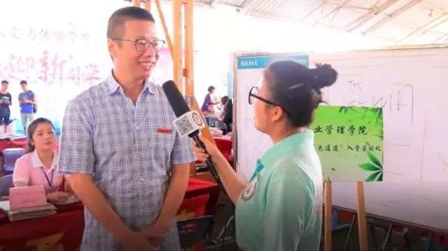 陆校长考察旅业管理学院迎新现场的方式说起来还有些特殊呢,陆校长扮演了一名来报道的新生,并向坐在旅业管理学院报道台的同学们咨询了一些问题。