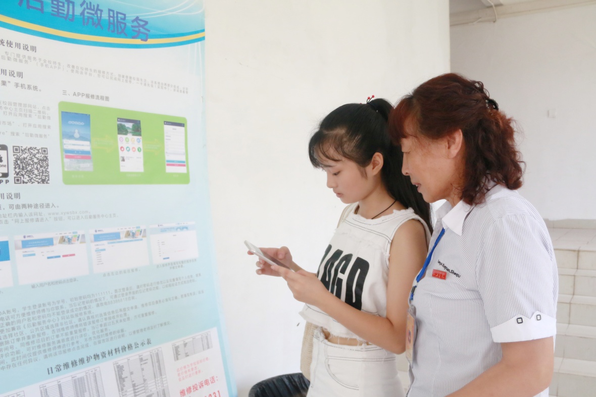 宿管工作人员为吕妮洪同学讲解宿舍网络保修问题