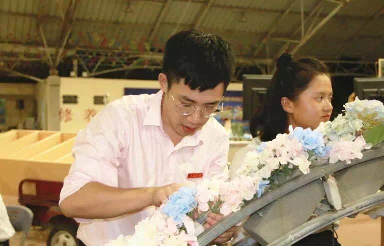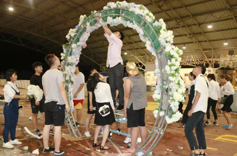 他们在深夜里、在清晨中,去搭建拱门、去布置现场、去设计场区,他们满脸汗水,满身疲惫,但是仍然坚守在岗,无声付出。