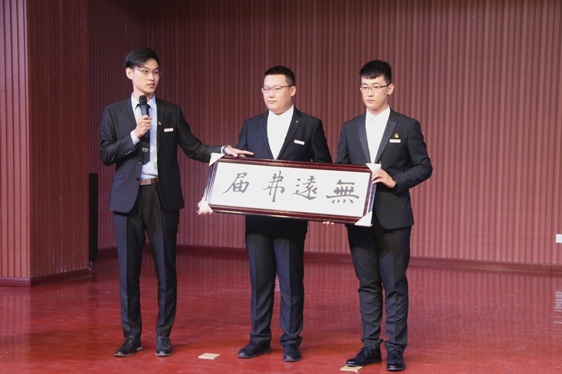 接着,进行校级四大学生组织交接仪式。主持人还邀请了上一届学生干部代表和新一届学生干部发表讲话,传承二字在他们之间凸显。期间,第十届主席团还赠于第十一届主席团一幅“无远弗届”的字画礼品,表达了老一届学生干部希望学生组织在未来的日子里可以坚定目标,坚持道路,越走越远的美好愿望。