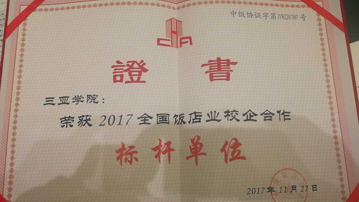 2017年11月27日,由国际饭店与餐馆协会、海口市人民政府支持,中国饭店协会、海南省商务厅联合主办的第二届中国饭店业大会在海口举行。本届大会为期三天,陆续举行第二届亚洲名厨大会、2017中国海鲜产业高峰论坛、2017全国饭店业校企合作大会暨海南省团餐发展大会、海南省互联网+餐饮暨餐饮业供应链创新与应用大会。在校企合作大会上,9159金沙游戏场荣获中国饭店协会颁发的“2017全国饭店业校企合作标杆单位”。