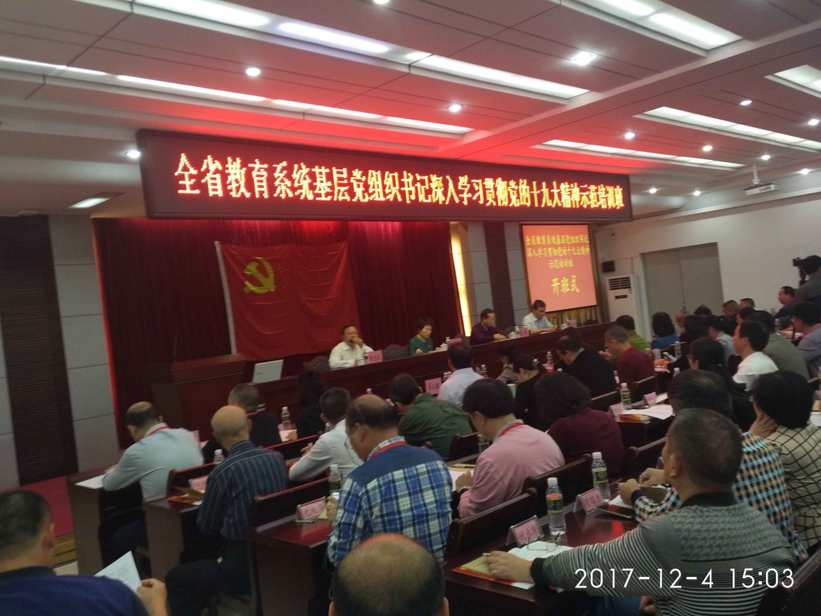 12月4日-12月7日历史三天半的培训学习充实丰富,主讲教师都是来自省教育厅、省教育工委、省委党校、十九大代表等,尤其是省教育厅厅长曹献坤和另外三位来自基层的十九大党代表生动的报告,使整个培训的气氛更加活跃,十九大的现场感更强,参加人员为全省教育系统基层党组织书记147人,分为6组,高校3组、中专1组、中学1组、教育局1组,有4名代表高校、中专、中学、教育局进行论坛发言。