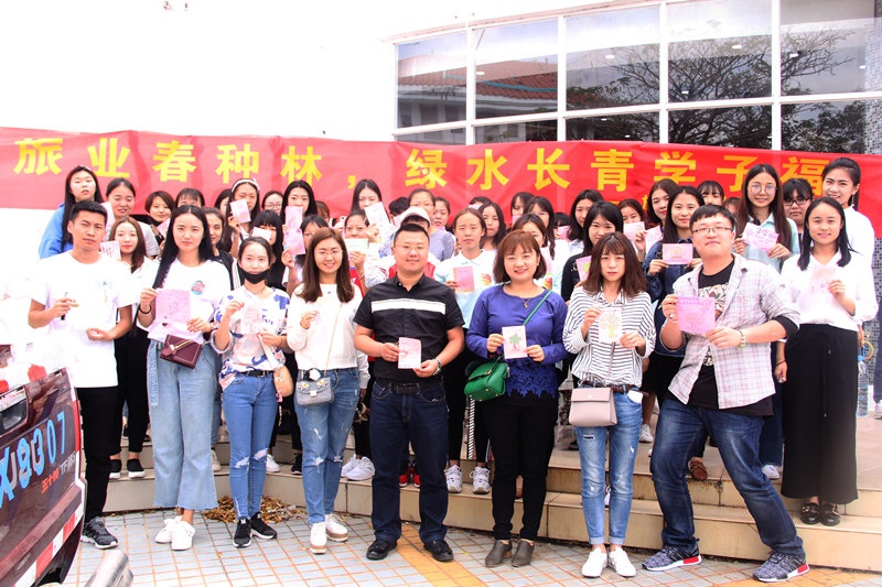活动开始,王翔书记拿着笔在“活力旅业春种林,绿水长青学子福”的横幅上写下自己的名字,以带头作用宣示着自己对保 护环境的一份信心。紧接着石玲老师、王曦茜老师、李湘婷老师也纷纷在横幅上留下自己的名字,并与活动全体成员合影留念。