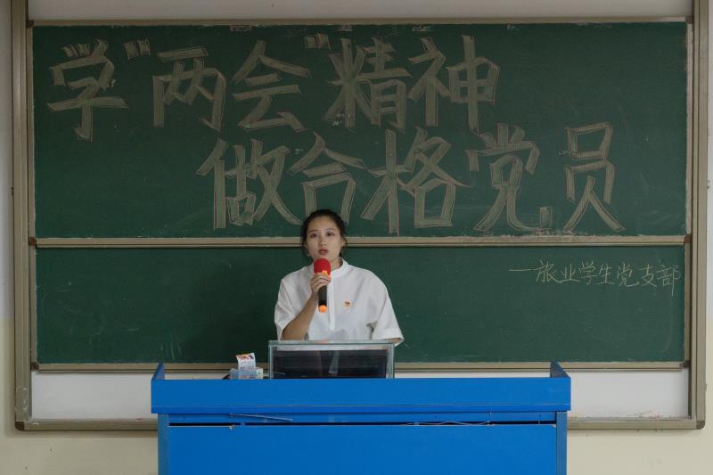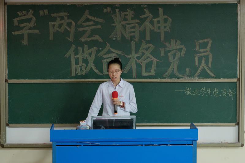 视频播放完毕后,会议进行第二项,由入党积极分子、预备党员、党员代表上台分享自己对两会新精神的总结与感想。