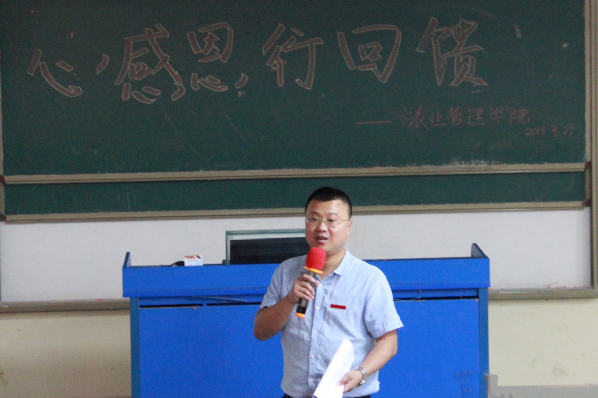 3月29号下午一点,我院在书知楼1208教室召开2018年“心感恩,行回馈”主题勤工会议。旅业管理学院党总支副书记王翔,思想导师石玲、王曦茜、李湘婷老师出席现场,为“心感恩、行回馈”公益服务实施方案宣讲保驾护航。