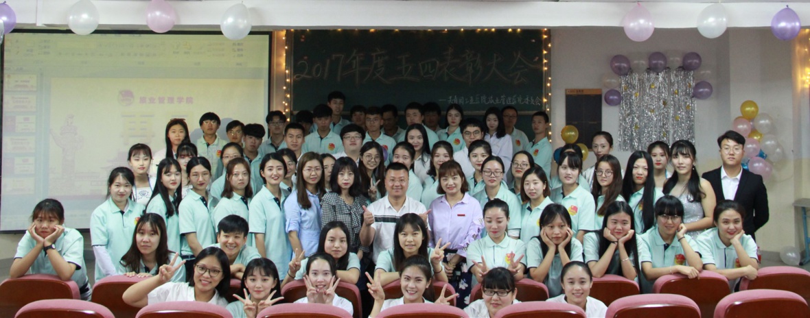 为了传承五四精神,弘扬五四精神给同学们带来的深远影响,也为了彰显我院团委大家庭的凝聚力,对近一年来先进集体和个人给予鼓励和支持,我院于2018年6月1日下午4时在书知楼1208教室举行五四表彰大会。此次大会到场嘉宾有党总支副书记王翔,思想导师石玲老师、王曦茜老师、李湘婷老师,旅业组织干部及获奖人员。