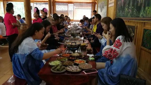 看完表演,这里有著名的苗族长桌宴,作为苗家最隆重的待客礼仪,长桌宴通常用于结婚嫁女、满月酒以及村寨联谊宴请活动。不过现在苗寨已经转化为商业经营,让更多的人感受到,长桌宴也不再局限于传统了。她们一边倒酒一边歌唱:“欢迎你到苗寨来,醇香米酒迎接你,你喜欢来一杯,不喜欢喝两杯,管你喜欢不喜欢也要喝三杯……”