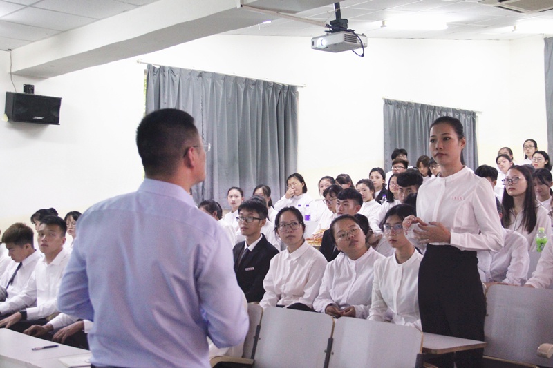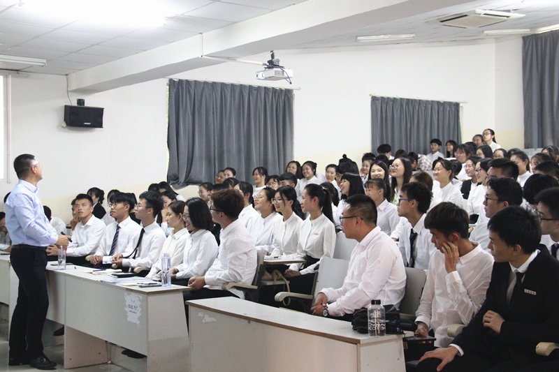 “成为酒店人,拓展工作机会,了解奢华行业,学习与成长,结识不同的朋友。”骆经理将在酒店工作中的好处一一与同学们进行分享,并与同学们进行良好的互动。同学们认真聆听了骆经理的演讲,并提出了许多自己的见解。