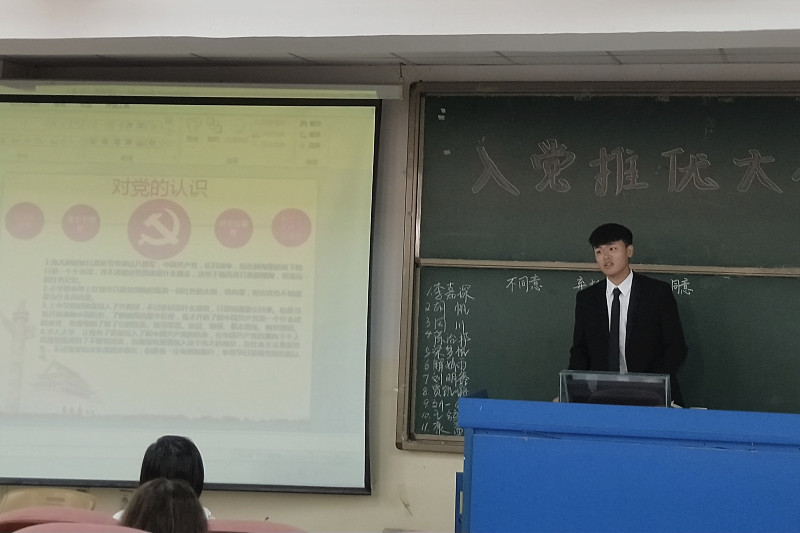10月26日星期五上午八时,酒店1801班于书知楼1208教室召开了入党推优大会,11位入党积极分子候选人上台演讲,思想导师祝弘扬点评并提问,由酒店1801班的同学投票。