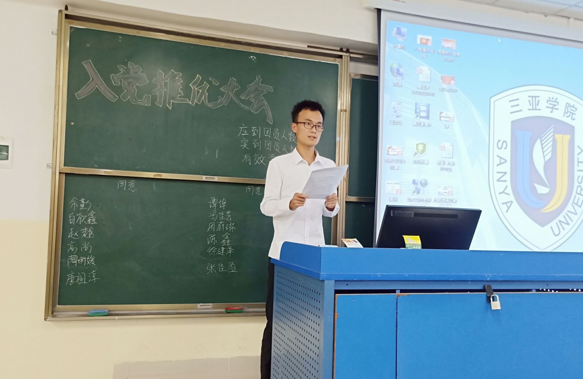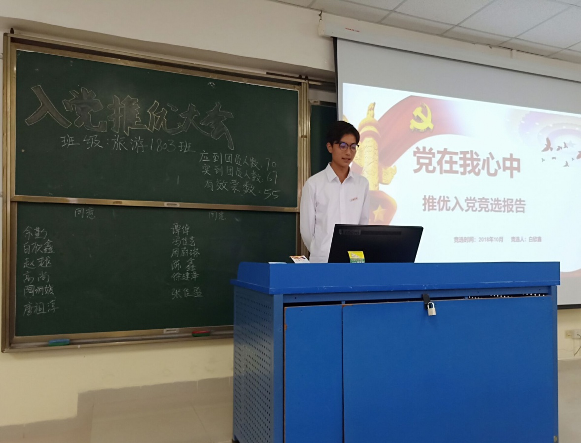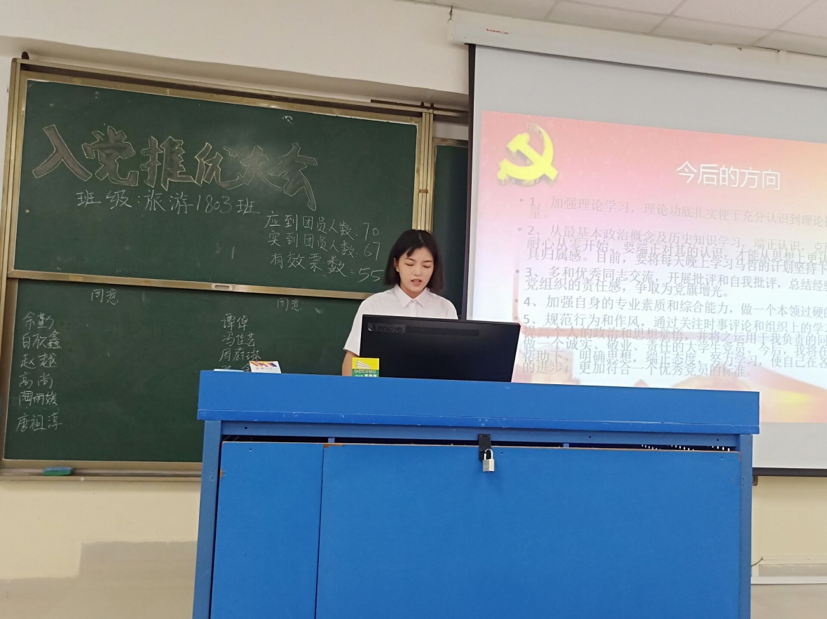 由我班团支书陈鑫主持推优大会开始,团委代表也在场监督以保证推优大会的顺利进行。先由团支书向大家讲解本次入党推优大会的流程和投票规则,紧接着递交入党申请书的团员依次上台演讲,表明了自己对党的认识和加入中国共产党的决心。