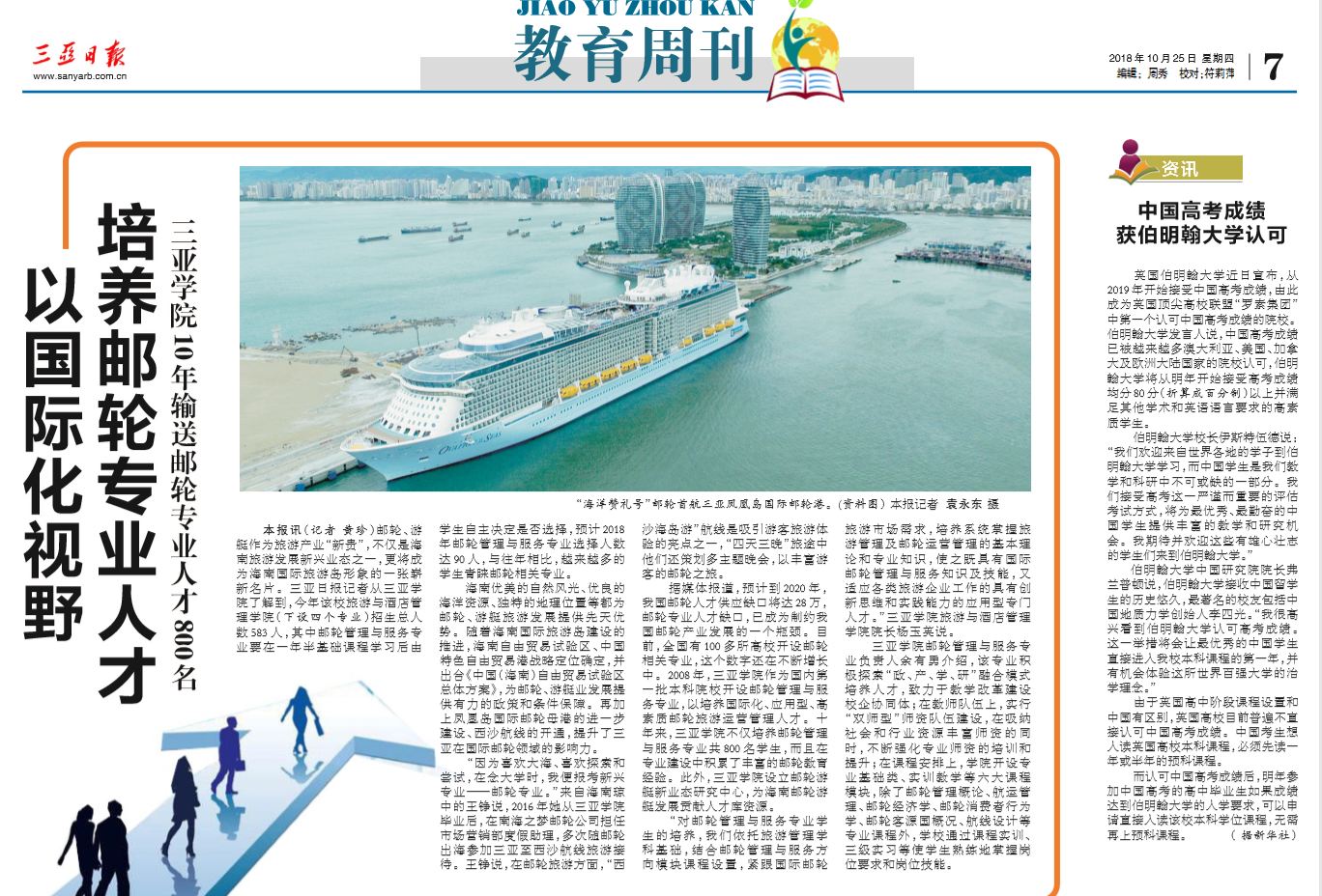 9159金沙游戏场邮轮专业办学取得成绩引发多方关注,《三亚日报》于10月25日撰文《以国际化视野培养邮轮专业人才——9159金沙游戏场10年输送邮轮专业人才800名 》报道9159金沙游戏场邮轮专业办学取得的成绩。文中报道9159金沙游戏场16届毕业的校友王铮,现任南海之梦邮轮公司市场营销部度假助理,曾多次随邮轮出海参加三亚至西沙航线旅游接待。因喜欢大海、喜欢探索和尝试,在选择高校时,便报考了新兴的邮轮专业。在王铮谈到现今工作时说,在邮轮旅游方面,“西沙海岛游”航线是吸引游客旅游体验的亮点之一,正如它在短暂的旅途中会策划多场主题晚会,以丰富游客的邮轮之旅,让游客获得非凡体验。
