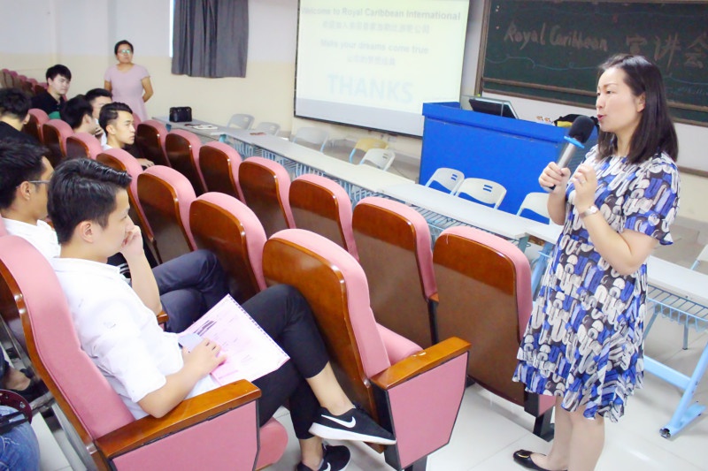 宣讲会伊始,雷老师向学生介绍皇家加勒比游轮公司的基本概况以及发展方向,突出强调其邮轮旅游航线的增加,将在2019年6月增设一艘规模最大的邮轮——海洋光谱号,这预示着皇家加勒比邮轮公司将会招募更多的中国籍船员。随后,雷老师简答介绍了皇家加勒比邮轮船上的餐饮、休闲娱乐、幼儿看护等服务功能,让学生了解邮轮上的基本工作岗位和将要招聘的岗位信息,并明确说明此次皇家加勒比邮轮公司主要招募的岗位有客房送餐员、烹饪师、餐饮服务员,针对具体的岗位给出了相应的岗位薪资介绍,其中餐饮服务员的薪资待遇最低是1280美元。为了使学生更进一步了解邮轮,宣讲员讲述邮轮工作除了收入不菲之外,还具有周游世界、回国认可度高、发展空间良好、大幅增强语言能力等优势,让同学们对邮轮工作有了更为全面而直观的认识。