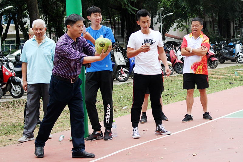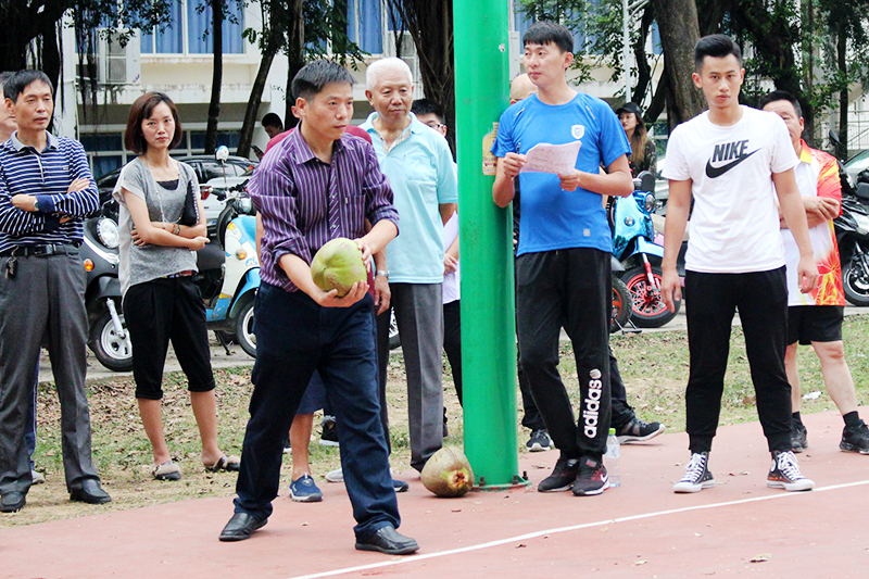 我院王水卿老师上场,右手手持椰子,目标锁定前方水瓶,摆好姿势,找准着力点,向前一抛,中了!经过一轮比拼,王水卿老师以优异成绩挺进决赛。在决赛又一轮的比拼后,最终,王水卿老师荣获第四名的好成绩。