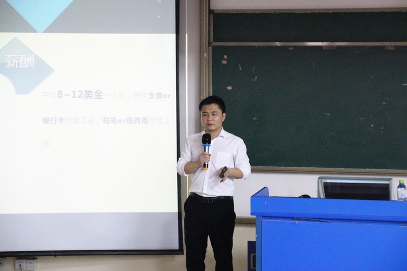 讲座开始前,一段关于在美国就业的视频将学生带入其中,美国政府面向全球高校本科大学生,大学生可利用暑假去美国企业带薪实习2-3个月,其目的是走进美国,互相了解他国文化。接着,宋老师在自我介绍之后开始对项目进行相关概述,主要以项目背景、岗位内容、住宿类型、项目收支、项目收获、报名事项为主讲内容,重点讲解岗位内容、项目优势和报名事项。此次项目具有合理安排、奖励津贴、安全保障的优势,他特别强调可为学生办J1签证(交流访问学者签),解决学生签证难的问题;SEVIS管理系统保障学生安全、24小时紧急支持服务为学生解答实习中所遇的问题;展现学生生活的周报制度与家长进行有效沟通。