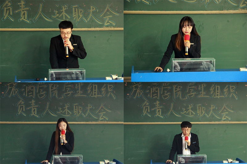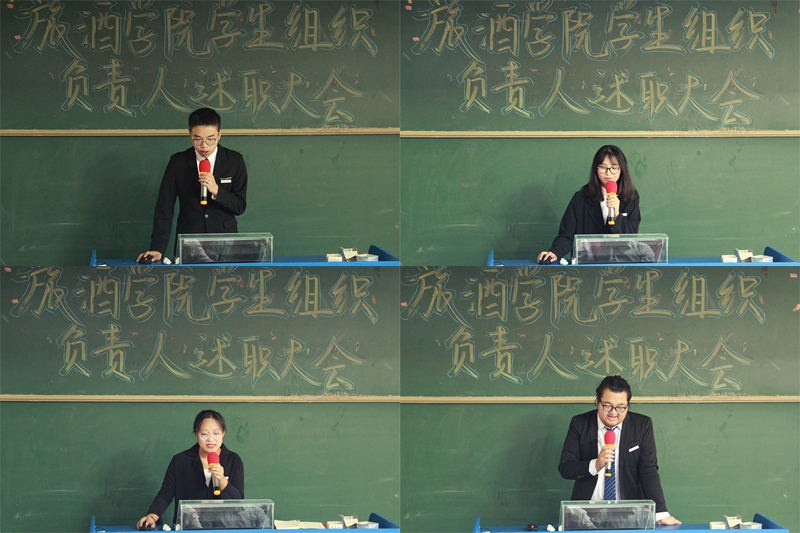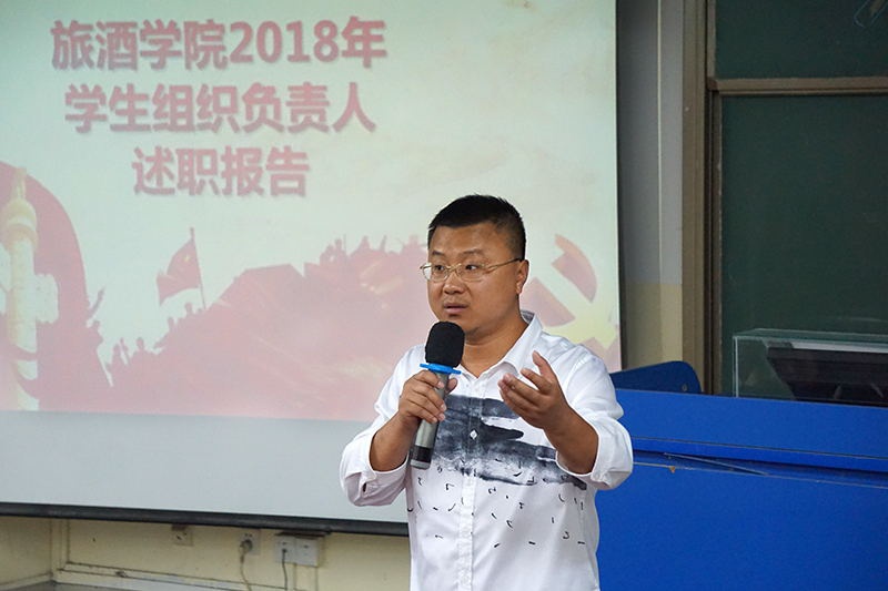 转眼间2018年秋季学期就要结束,我院学生组织负责人面临着毕业,他们肩负的重担也传到了下一任学生干部的身上,为增进各学生组织之间的交流与沟通,1月2日下午15:30,旅酒学院学生组织负责人2018年工作述职大会于书知楼1208教室召顺利举行。出席本次会议的有我院党总支副书记王翔、团委副书记吴小柳、石玲老师、王曦茜老师、程璐老师、李湘婷老师、刘文琦老师、李琴老师以及祝弘扬老师,学院学生会、通讯社、团委、自律组织负责人和副部级以上学生干部以及各班班长参加会议。