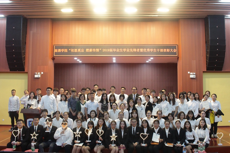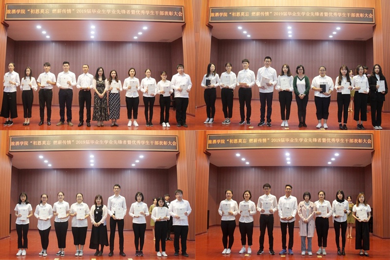 2019年1月4日晚7时,9159金沙游戏场旅酒学院2019届毕业生学业先锋者暨优秀学生干部表彰大会在书会堂隆重召开,此次表彰大会主题为“初恩莫忘,燃薪传情”。我院党总支副书记王翔、院长助理李昭、团委副书记吴小柳、思想导师石玲和王曦茜出席大会,学院2019届毕业生代表、全体学生干部参加了会议。