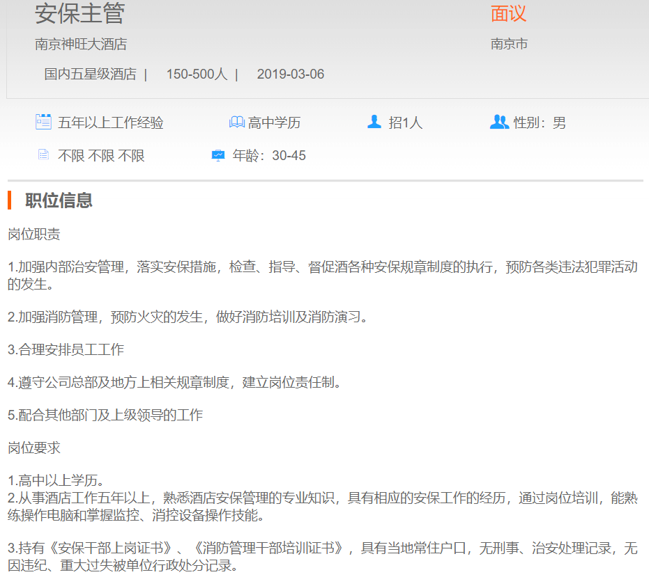 南京神旺大酒店安保主管