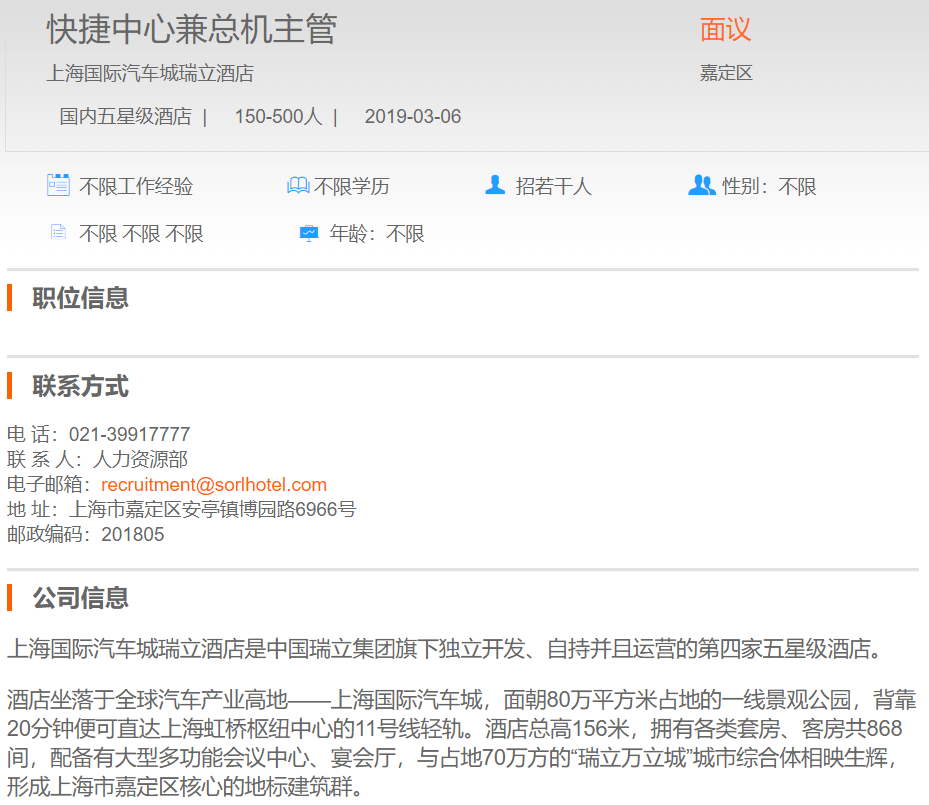 上海国际汽车城瑞立酒店快捷中心兼总机主管