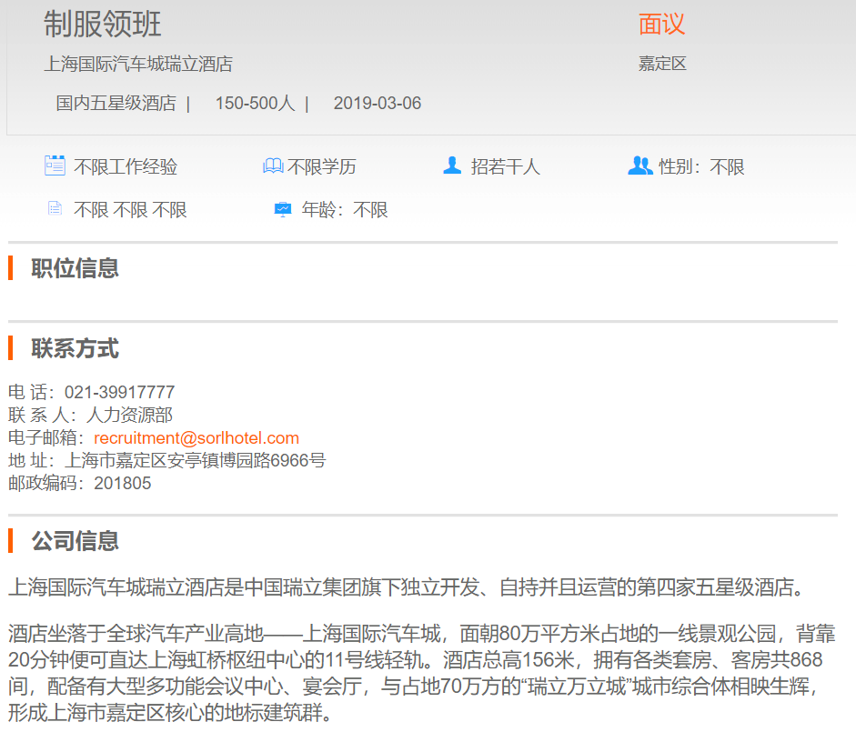上海国际汽车城瑞立酒店制服领班