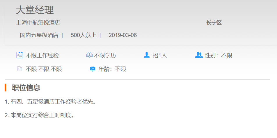 上海中航泊悦酒店大堂经理