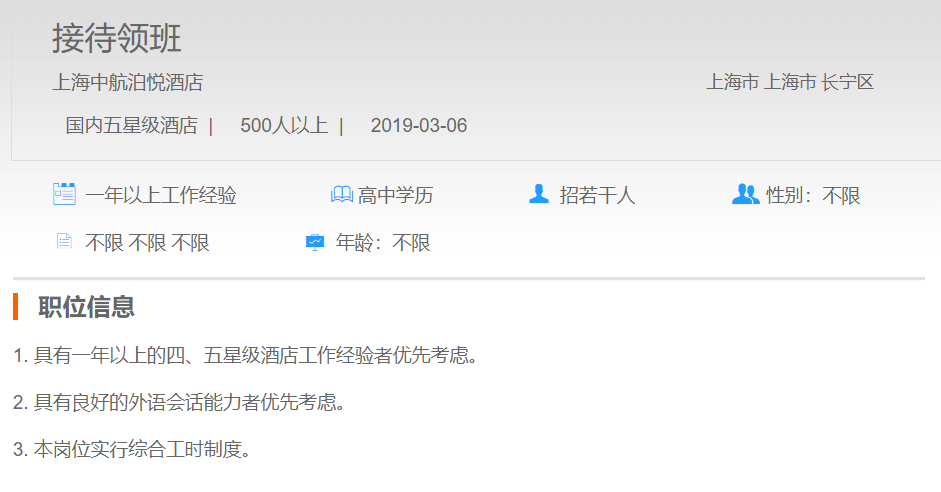 上海中航泊悦酒店接待领班