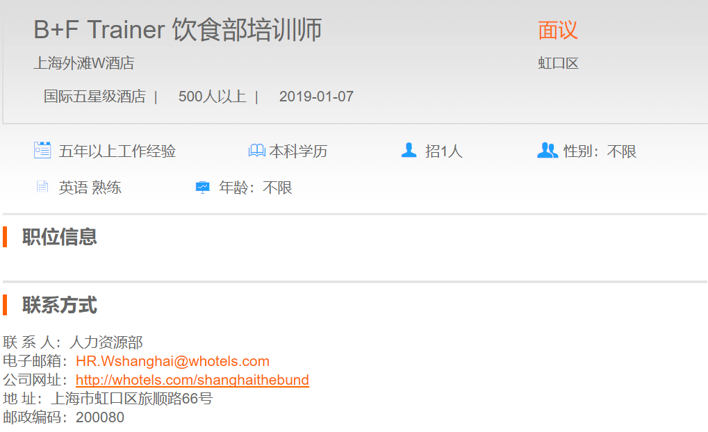 上海外滩w酒店饮食部培训师