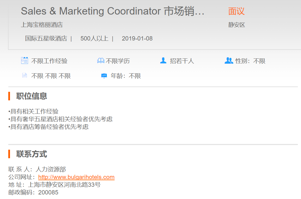 上海宝格丽酒店市场销售协调员