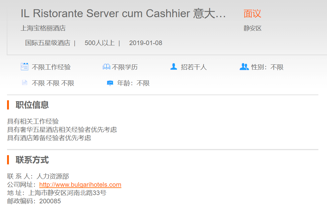上海宝格丽酒店意大利餐厅服务员