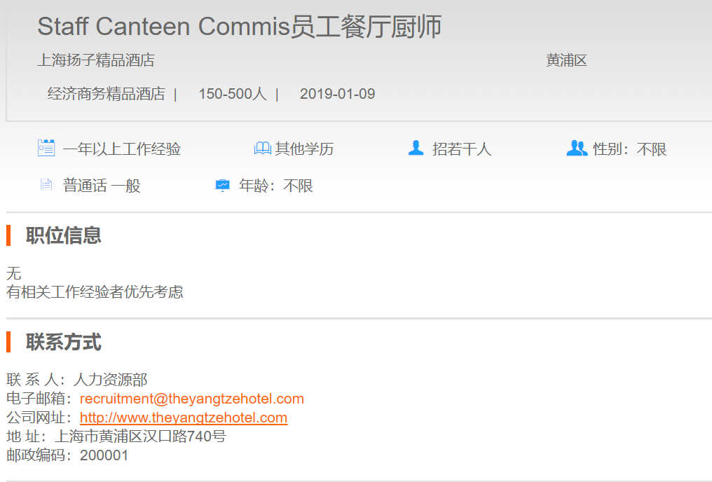 上海扬子精品酒店员工餐厅厨师