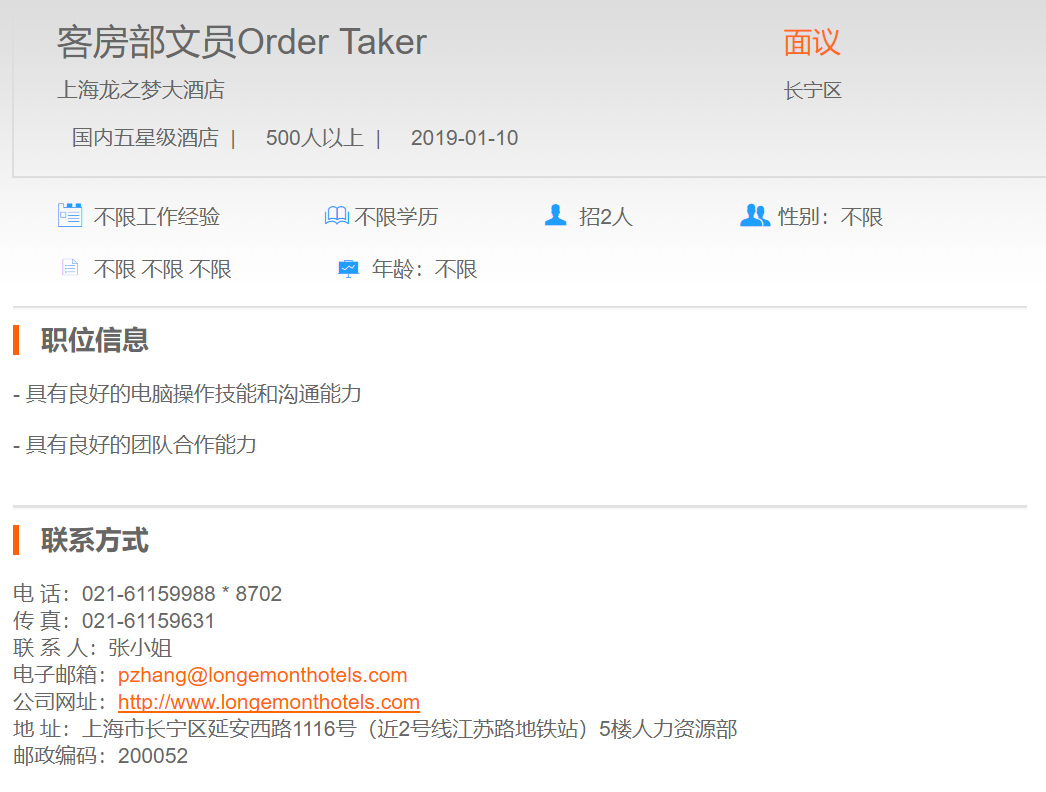 上海龙之梦大酒店客房部文员
