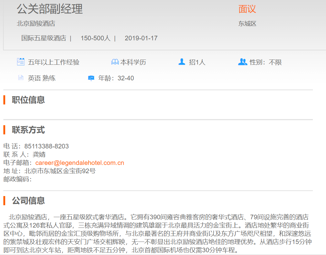 北京励骏酒店公关部副经理