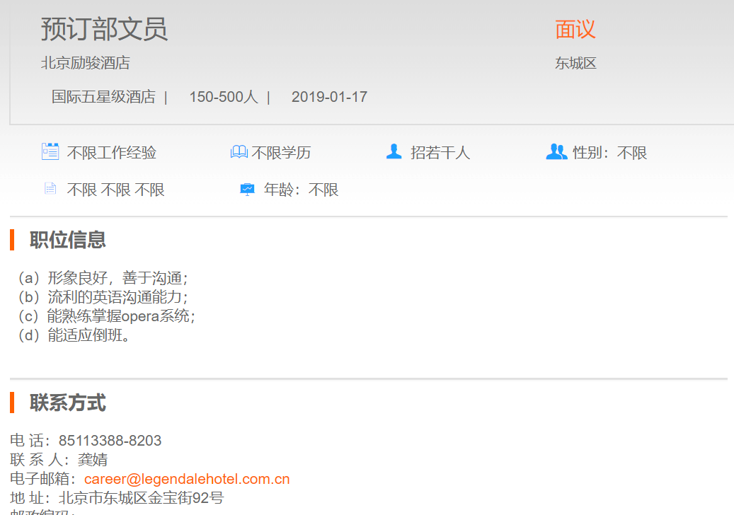 北京励骏酒店预订部文员
