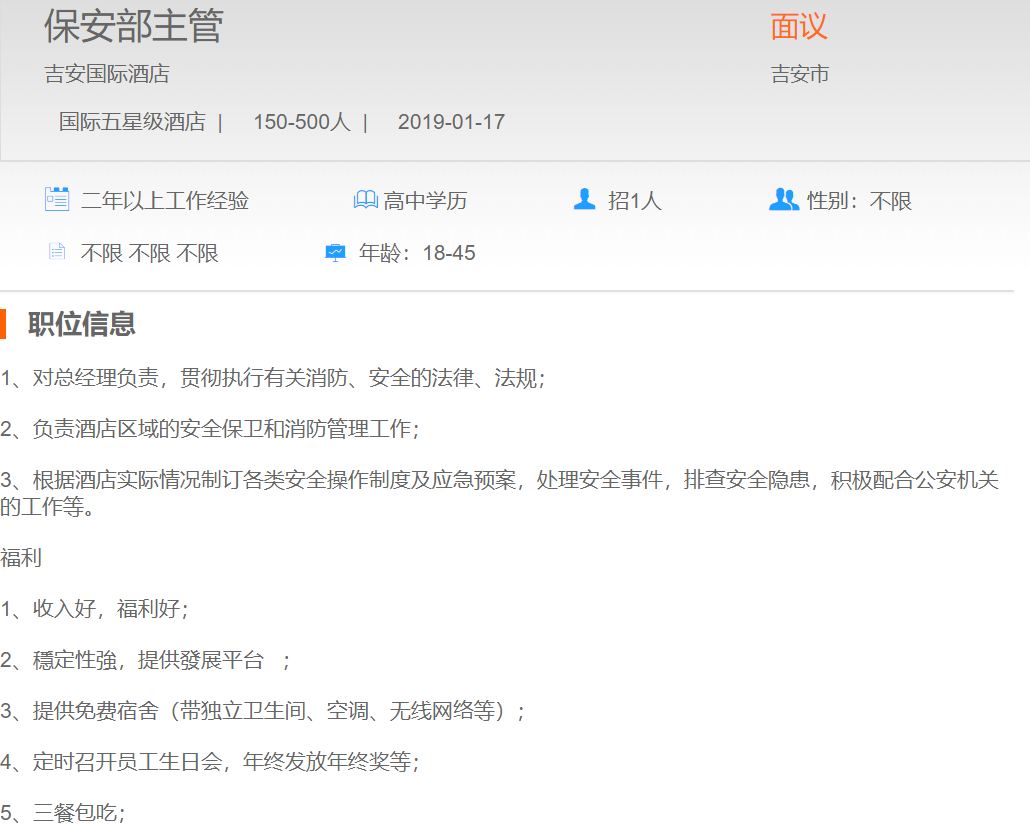 吉安国际酒店保安部主管