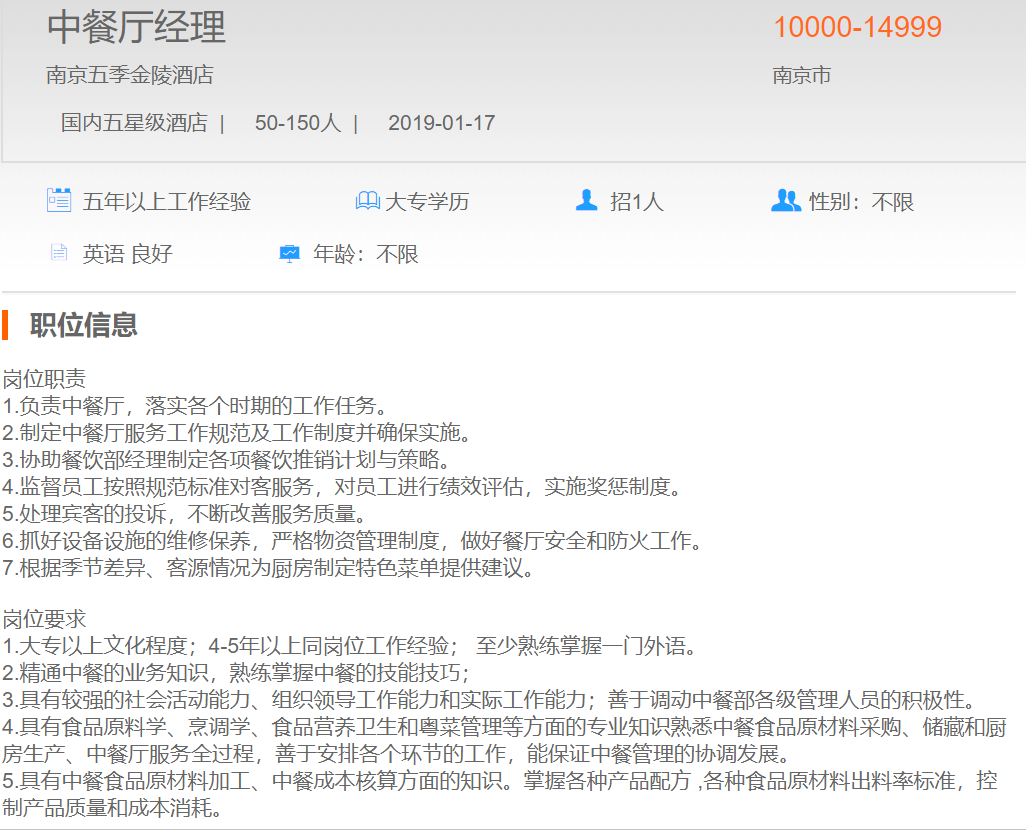 南京五季金陵酒店中餐厅经理