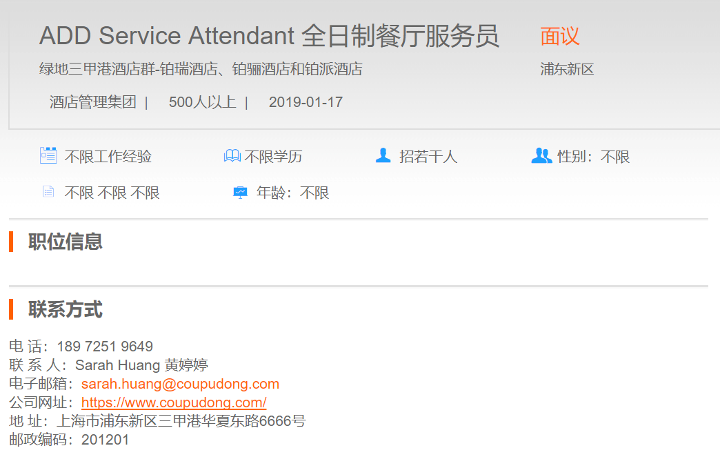 绿地三甲港酒店群全日制餐厅服务员