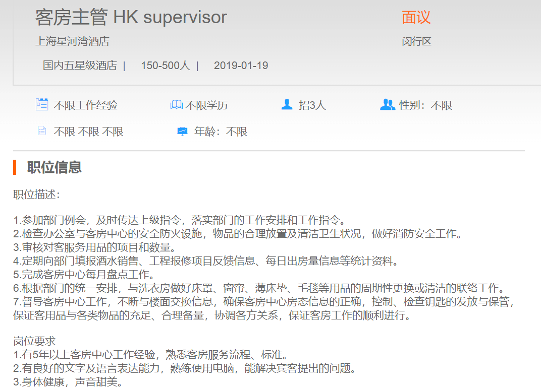 上海星河湾酒店客房主管