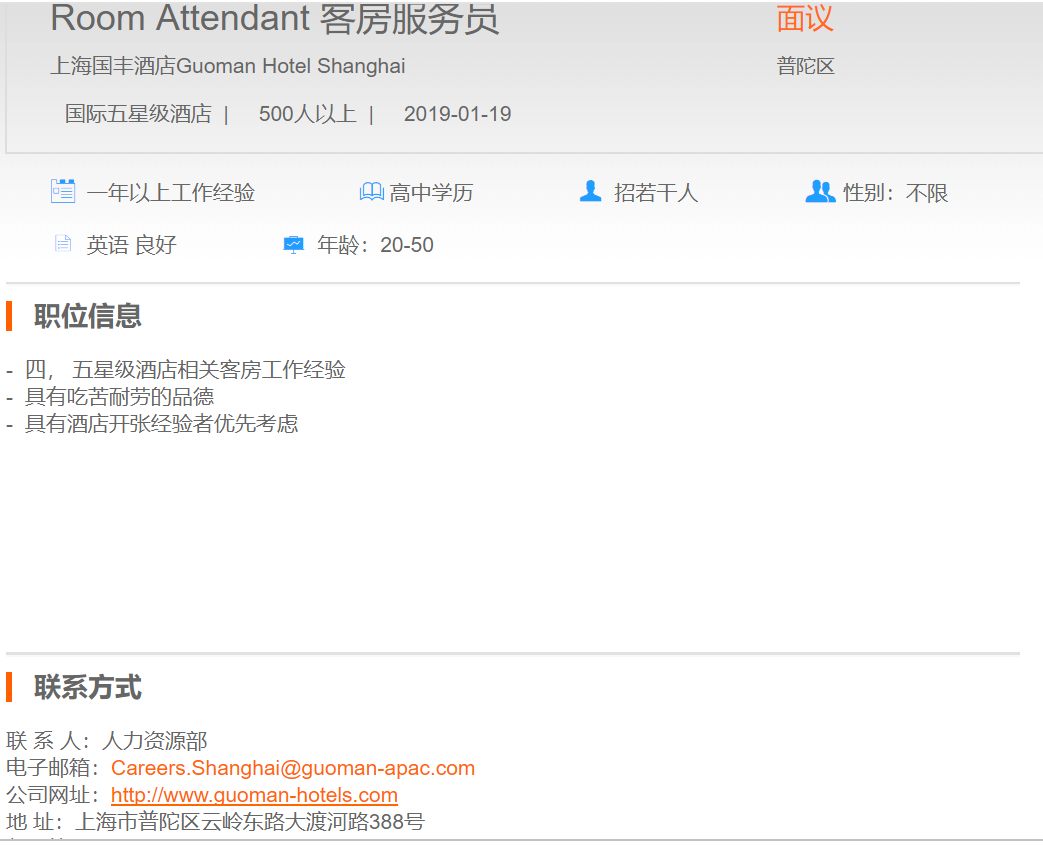 上海国丰酒店客房服务员