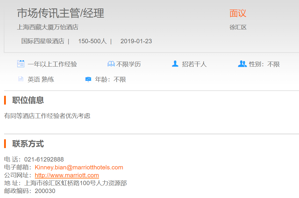上海西藏大厦万怡酒店市场传讯主管|经理