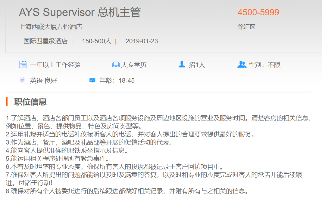 上海西藏大厦万怡酒店总机主管