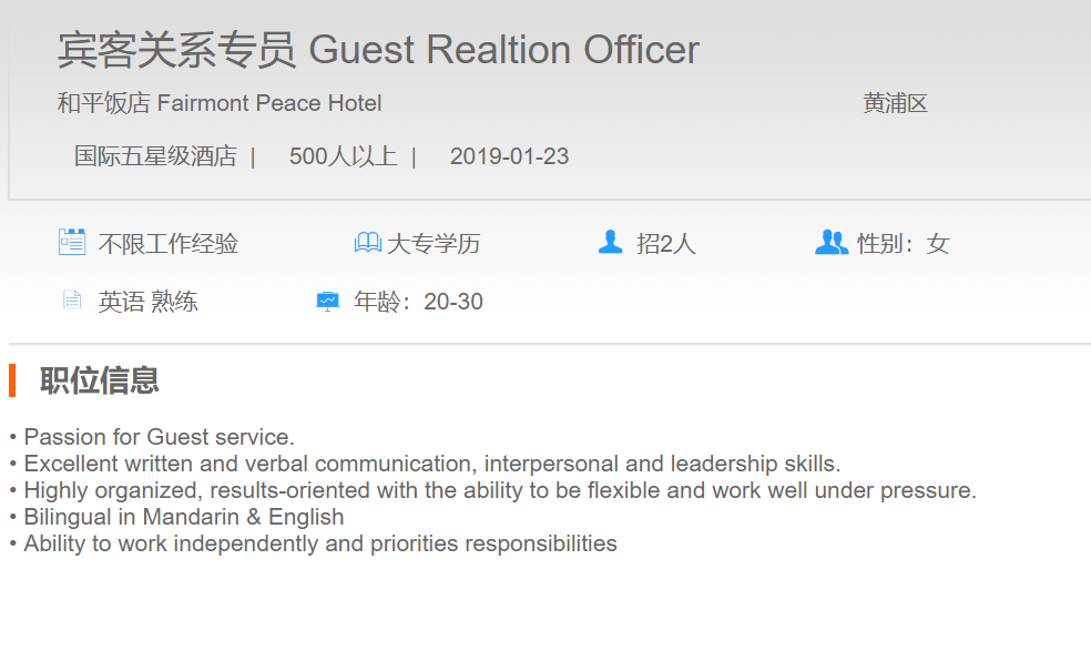 和平饭店宾客关系专员