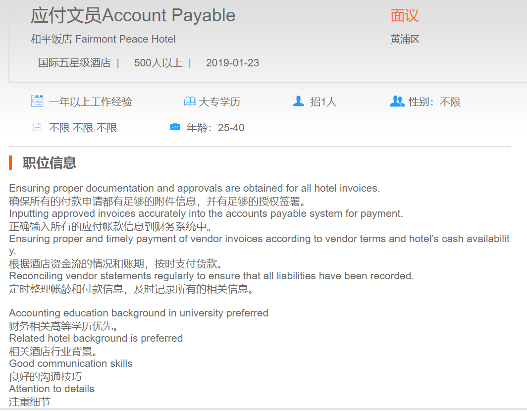 和平饭店应付文员
